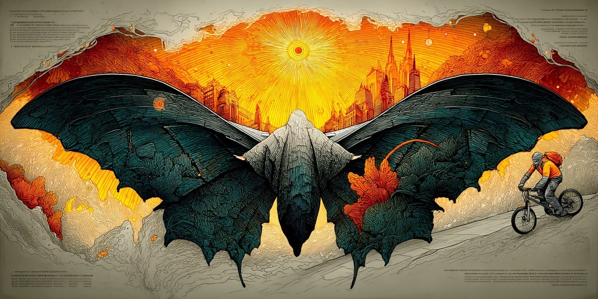 Автоперевод: Лазершарп, нарисованный на крыльях бабочки, представляет собой равноправную фотографию на велосипеде Иисуса Христа на велосипеде Пеннирида, поднимаясь по крутому холму на его неонковом кросс -перекрестном подронке Храм Крыльев Хракона, искусство, искусство, искусство, искусство