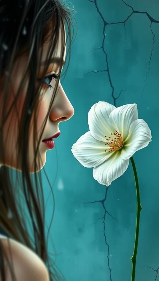 A beautiful white flower with closed petals is located on the left side of an aged, cracked turquoise background, and in front, there is the profile of a young woman with long hair, in the style of digital art, with pastel colors, smooth lines, fantasy elements, a dark gray-blue-yellow color palette, high resolution, very detailed, fine details, professional photography, and depth of field, creating a cinematic effect.
