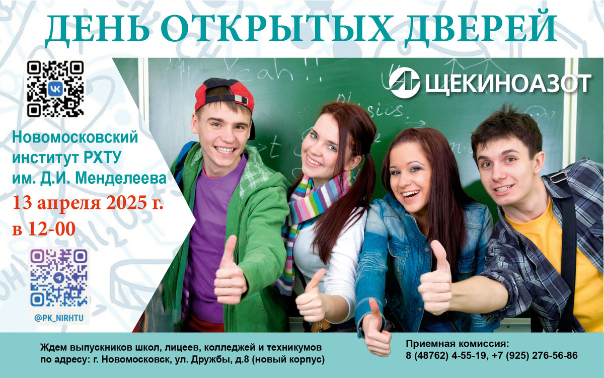 ДЕНЬ ОТКРЫТЫХ ДВЕРЕЙ Новомосковского института РХТУ им. Д.И. Менделеева Вниманию выпускников школ и их родителей! 13 апреля в 12-00 в Новомосковском институте РХТУ им. Д.И. Менделеева состоится День открытых дверей! Ждем выпускников школ, лицеев, колледжей и техникумов по адресу: г. Новомосковск, ул. Дружбы, 8 (новый корпус). Приемная комиссия: +7 (48762) 4-55-19, +7 (925) 276-56-86. Это отличная возможность узнать больше о жизни в университете и сделать правильный выбор для своего будущего. Вход – свободный! Подробности - по ссылке. Также напоминаем, что есть возможность рассмотреть поступление на целевые места в вуз от компании «Щекиноазот» и получить поддержку предприятия на всех этапах обучения и старта карьеры. По вопросам поступления на целевые места обращаться по телефонам: +7 (48751) 9-24-78, 9-33-60, 9-28-37, 5-55-70.