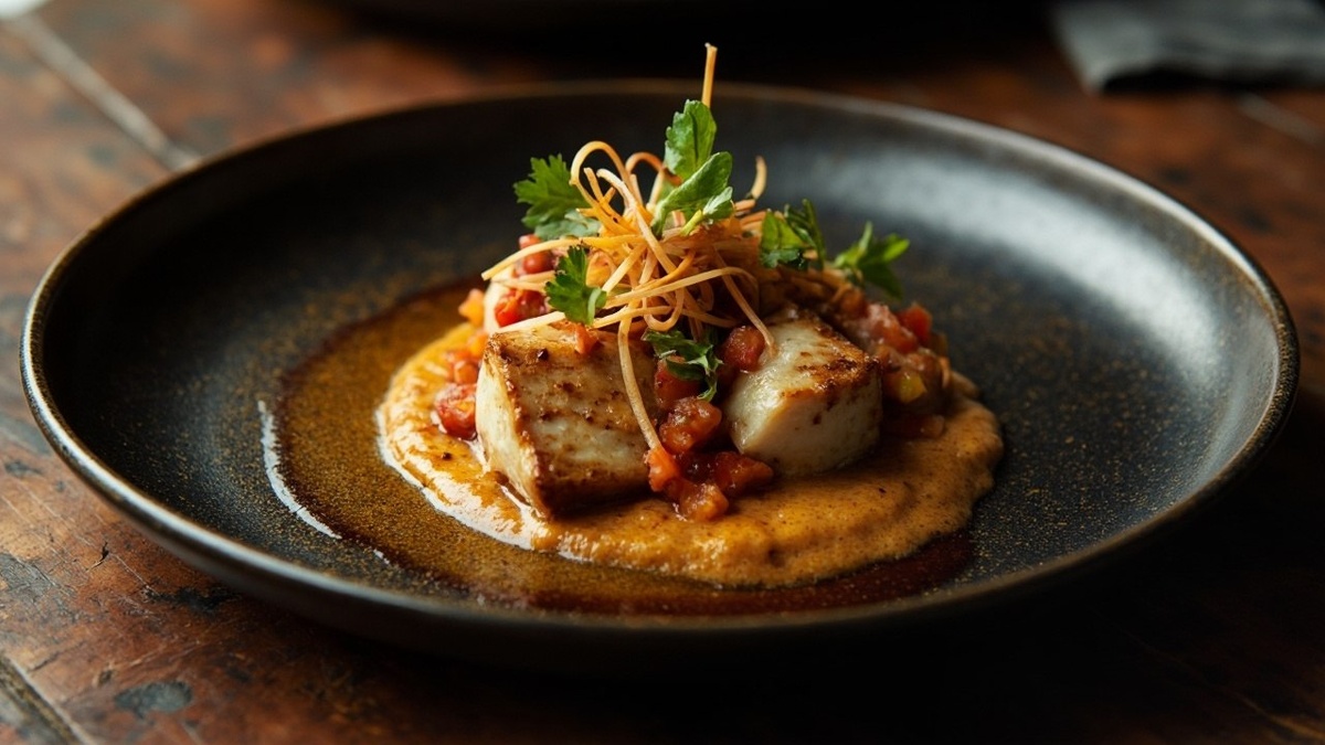 - Используйте большие плоские тарелки темного цвета, чтобы подчеркнуть насыщенный цвет соуса.