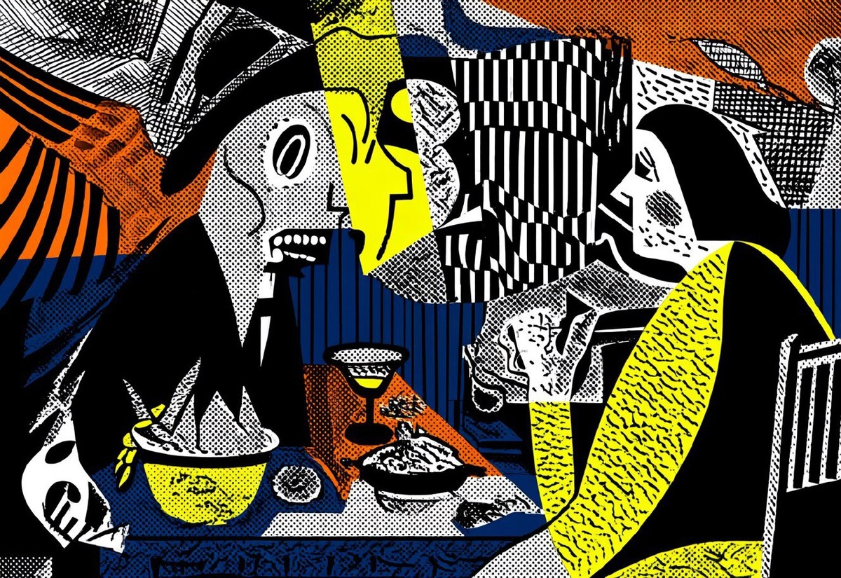 Создано на основе запроса: 'Guernica' by Pablo Picasso in the style of pop art --- Автоперевод: «Guernica» Пабло Пикассо в стиле поп -арта Что скажешь? 🤔 https://dzen.ru/id/65c0c65c86e4f837c27b24d7 #ИИ #AI #нейросеть #midjourney #art