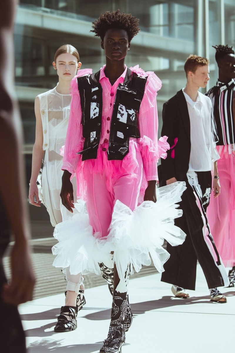 Создано на основе запроса: outside summer fashion show, 5 models, very real-looking, colours of pink, black, and white