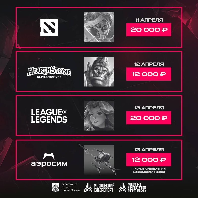 Турниры этой недели от CYBERMOS! 🎮 Dota 2 I 11 апреля Регистрация — vk.cc/cKo4vG Призовой фонд: 20.000₽ 🎮 HSBG I 12 апреля (трансляция) Регистрация — vk.cc/cKo4B2 Призовой фонд: 12.000₽ 🎮 League of Legends I 13 апреля Регистрация — vk.cc/cKo4RK Призовой фонд: 20.000₽ 🎮 Аэросим I 13 апреля Регистрация — vk.cc/cKCtoO Призовой фонд: 12.000₽ + пульт управления RadioMaster Pocket Полный календарь на апрель тут. Трансляции проходят в сообществе CYBERMOS. CYBERMOS. Подписаться