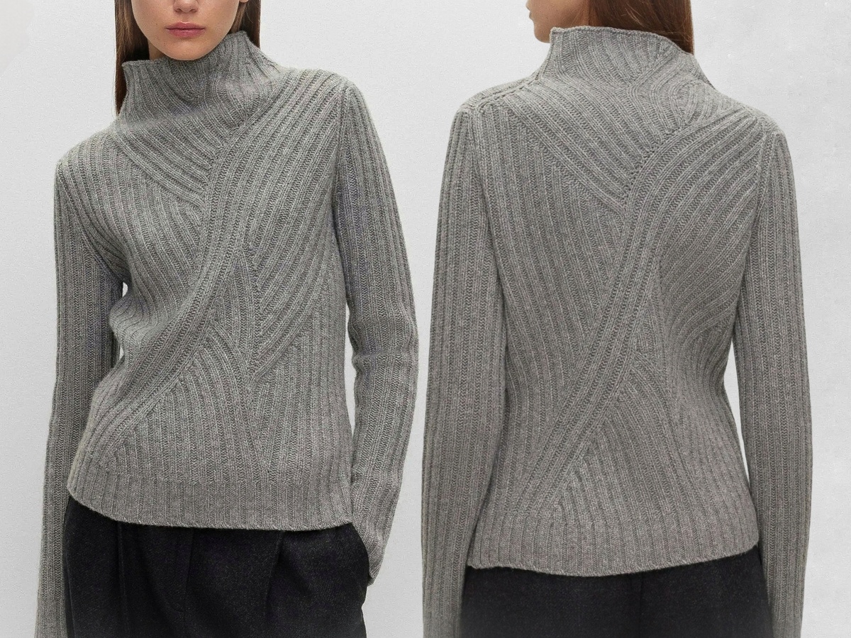 И ведь что интересно: свежепредложенная модель связана из тёмной меланжевой пряжи, а во втором варианте — из светлой однотонной, персикового оттенка (модель от бренда Stefanel). Из-за разницы в пряже узор выглядит совершенно по-другому! В тёмном меланже он смотрится более смазанным, а в светлом персиковом — с акцентом на текстуру.