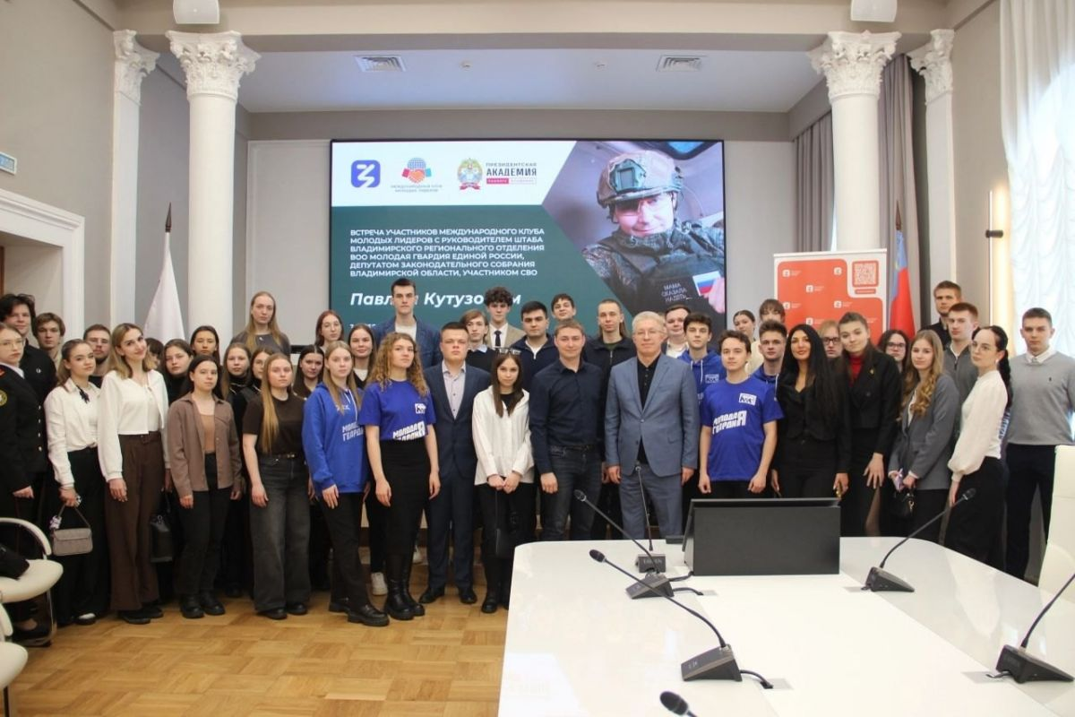 Участники международного клуба молодых лидеров встретились с руководителем Владимирского штаба «Молодой Гвардии Единой России», участником специальной военной операции Павлом Кутузовым. Во встрече также участвовали депутат Законодательного Собрания, ветеран СВО Валерий Малышев и председатель Молодежной думы Анна Алексеева