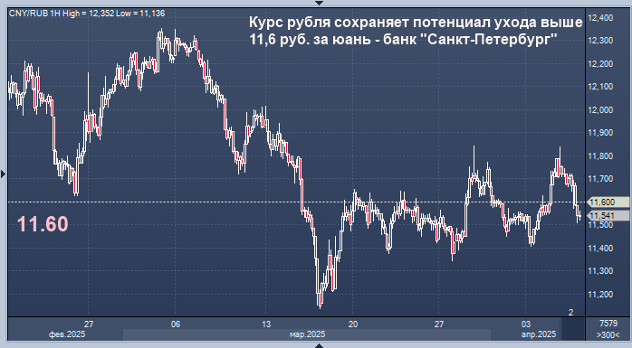 Курс рубля сохраняет потенциал ухода выше 11,6 руб. за юань - банк "Санкт-Петербург" Курс доллара к рублю расчётный, фьючерс, вечный фьючерс и межбанк. Курс евро к рублю расчётный, фьючерс, вечный фьючерс и межбанк. Курс юаня к рублю биржевой, фьючерс, вечный фьючерс и межбанк. Курс валютной пары юань/рубль сохраняет потенциал возврата выше уровня 11,6 руб. за юань по мере исчерпания временной поддержки со стороны выросшего предложения валюты ЦБ РФ, говорится в комментарии аналитиков банка "Санкт-Петербург". Также эксперты отмечают, что риски повторного ухода котировок нефти марки Brent в сторону $62 за баррель пока остаются. Настоящее сообщение содержит мнение специалистов инвестиционной компании или банка, полученное Интерфаксом. Такое мнение предоставляется исключительно для целей ознакомления и не является рекомендацией для покупки, продажи ценных бумаг, принятия (или непринятия) каких-либо коммерческих или иных решений. За содержание сообщения и последствия его использования Интер