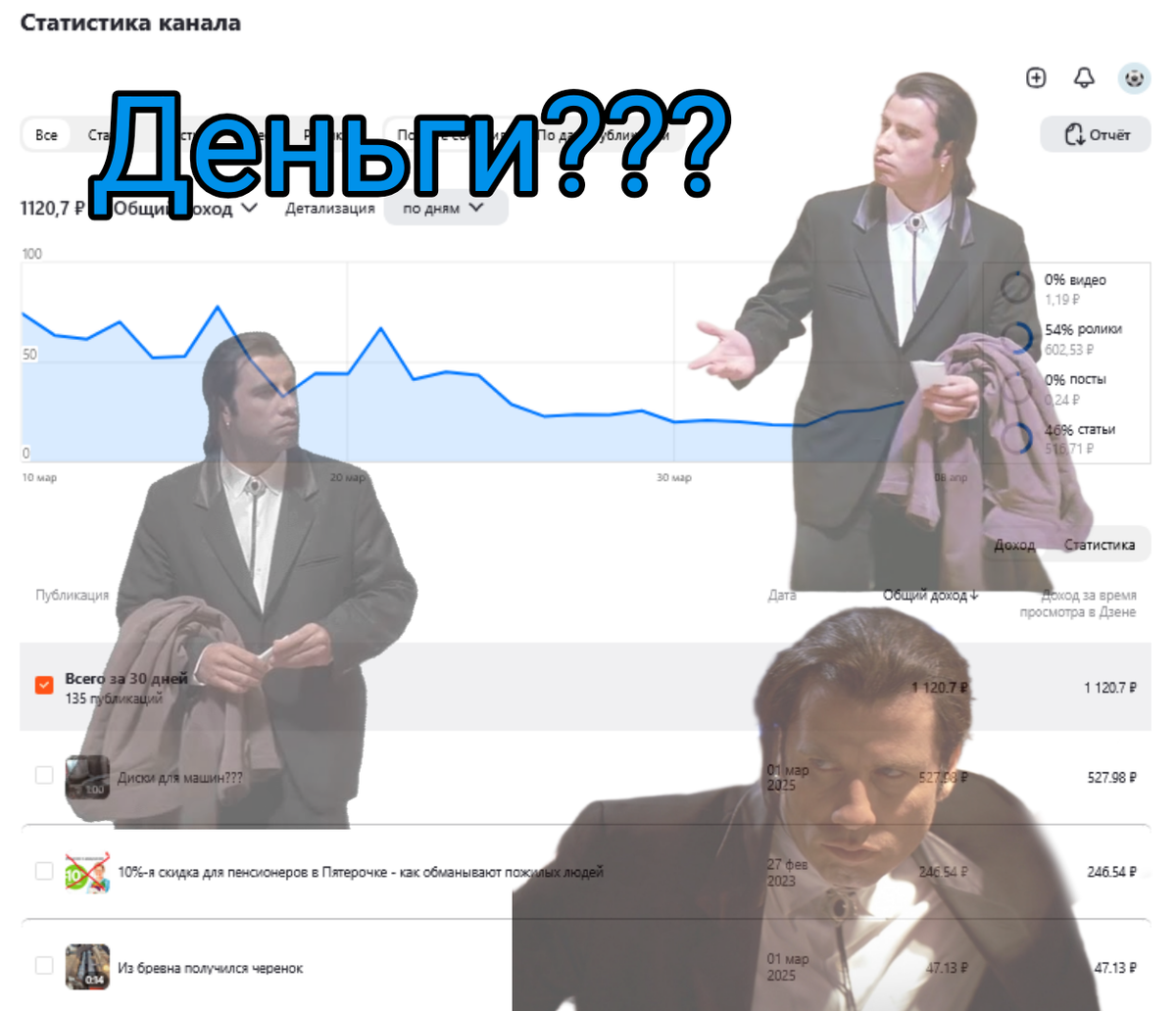 Этому каналу 2.5 года. Первая статья вышла 13 сентября 2022 года. На тот момент я активно работал в Пятерочке и мне было чем поделиться. Алгоритмы Дзена тогда были совсем иные. Показов давали тысячами, как и просмотров было предостаточно. Канал быстро вышел на монетизацию, но... все эти тысячи показов и просмотров приносили сущие копейки. На тот момент я выше 25 рублей в день никогда не получал.