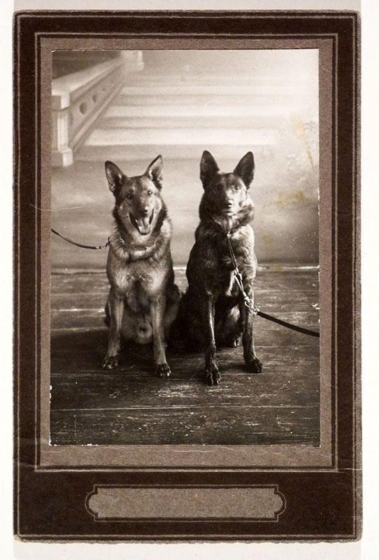 Фото на паспарту. Первые сыщики в Кургане: слева - Крон; справа - Герта. Проводник Максимов Михаил. 1920-е гг. Источник: "Курганский областной краеведческий музей" https://vk.cc/cKBgK8