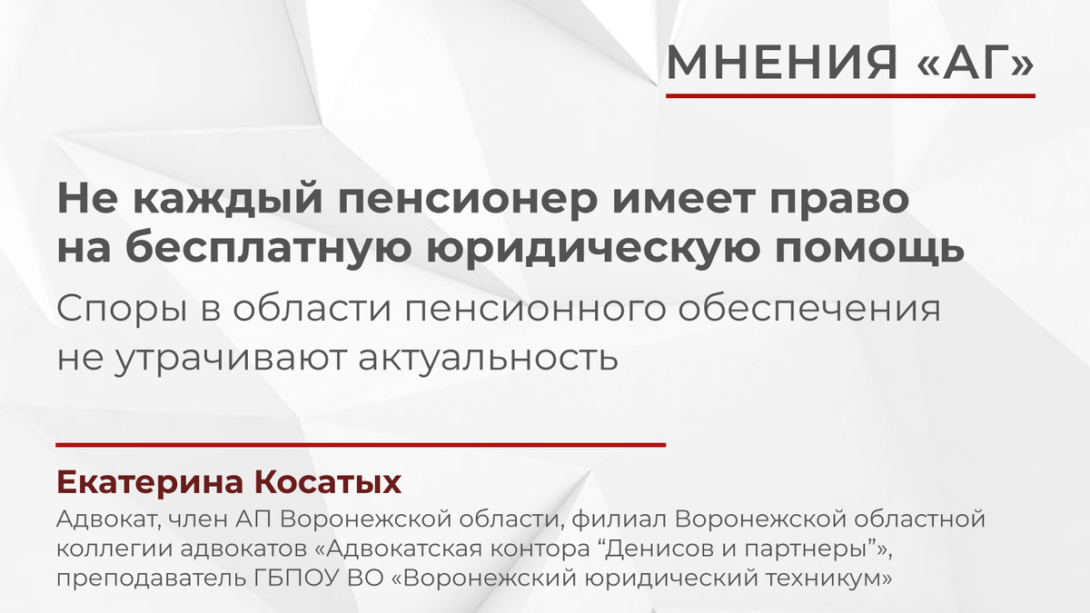Адвокат, член АП Воронежской области, филиал Воронежской областной коллегии адвокатов «Адвокатская контора “Денисов и партнеры”», преподаватель ГБПОУ ВО «Воронежский юридический техникум» Екатерина Косатых комментирует законопроект, которым предлагается распространить право на получение бесплатной юридической помощи на пенсионеров. «Высокий процент удовлетворенных исков дает основания полагать, что граждане, обращаясь в суды, чаще всего имеют обоснованные претензии, подтверждающие их право на пенсионное обеспечение», – отмечает автор. Подробнее читайте на сайте «АГ». Наш канал в «Telegram». Подпишись, чтобы быть в курсе!