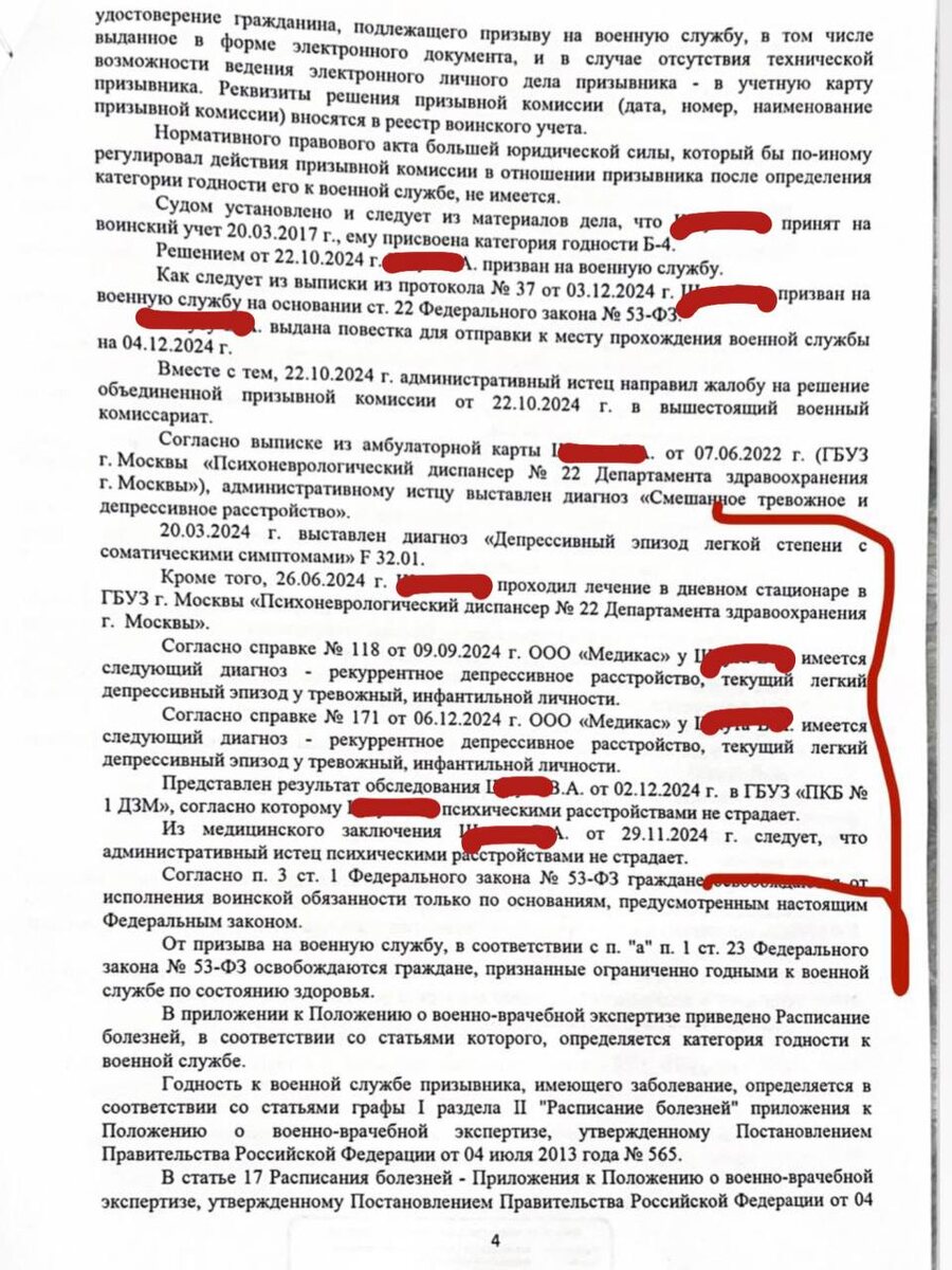 О парне, которому сняли психиатрический диагноз во время дообследования по направлению от военкомата в ПКБ им. Н. А. Алексеева. Ситуация: при подготовке к призыву к личному делу в ЕЦП были приобщены документы, подтверждающие наличие психиатрического диагноза у призывника. В ЕЦП после медосвидетельствования — годен с незначительными ограничениями, отправляйся служить🤷🏻♂️ Обжаловали, после КМО по нашей жалобе парень был отправлен на дообследование. Во время дообследования в ПКБ №1 как раз и сняли диагноз. Пошли в суд. И вот тут смотрите, как интересно суд мотивирует отказ: мол, да, вот болел и вот болел, подтверждения есть, но ведь вот оно — одно решение из ПКБ №1, а значит «административный истец психическими расстройствами не страдает». Вопросов много. Один из них: а на каком же основании в ЕЦП было принято решение о годности призывника к прохождению службы, если на тот момент заключения из ПКБ №1 со снятием диагноза ещё не было?🤦🏻♂️ У суда ответа нет. Работаем дальше ✊🏻