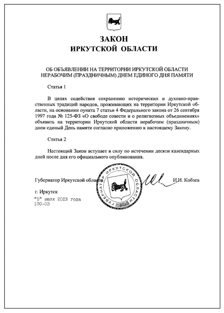 29 апреля 2025 года праздник (нерабочий день) – Единый день Памяти в Иркутской области