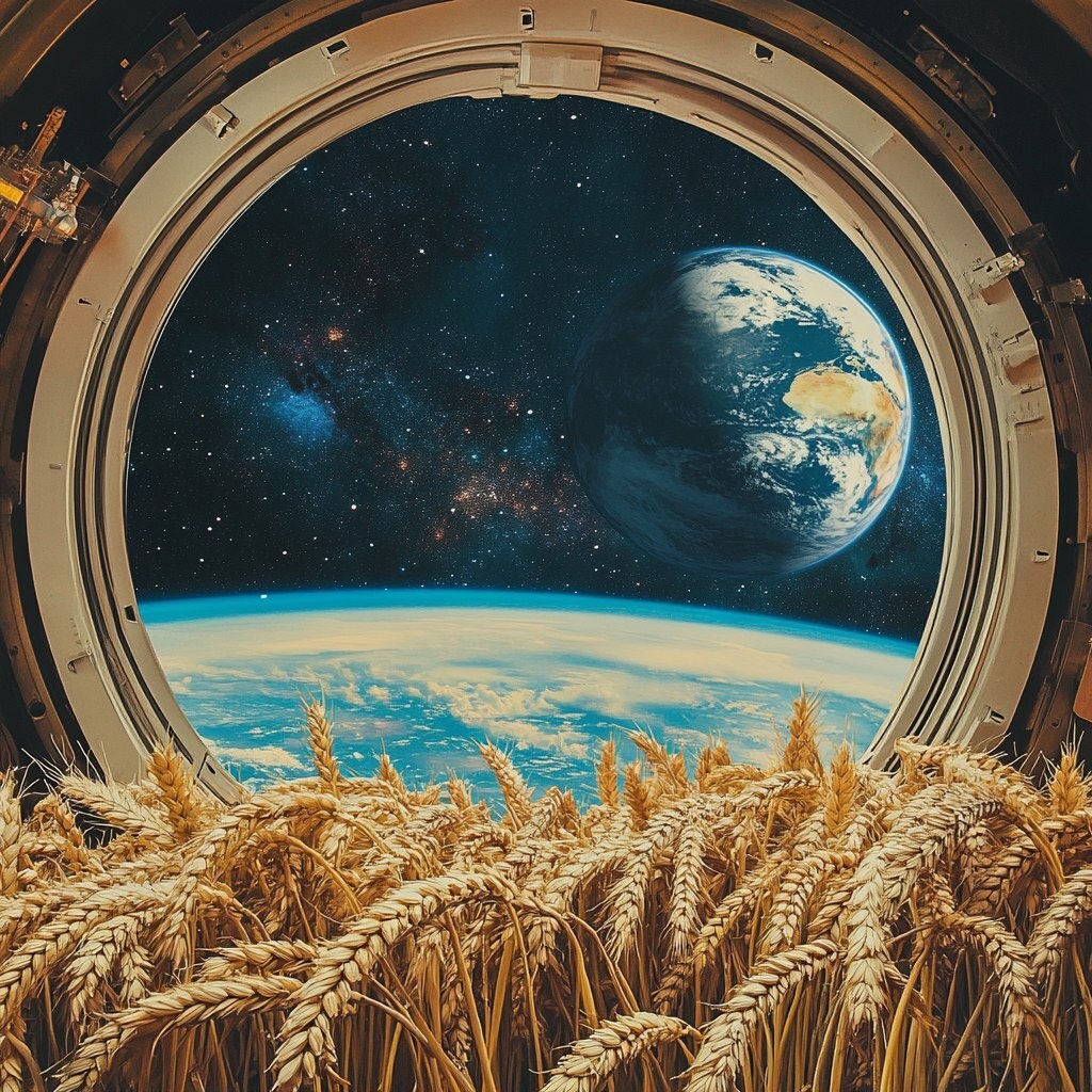 Создано на основе запроса: collage style, wheat grows large in the foreground, the porthole of the space station is visible, in which both