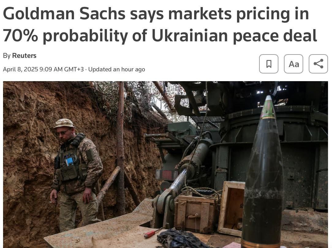 Агентство Reuters пишет, что американский инвестиционный банк Goldman Sachs обнародовал свой прогноз вероятности заключения мирного соглашения по Украине. Анализ ценообразования облигаций и ситуации на рынках позволяет оценить вероятность замирения довольно высоко – 70%, что резко выше, чем до ноябрьских выборов президента США Дональда Трампа. «Наше моделирование показывает, что текущая рыночная цена мирного соглашения выросла с менее чем 50% до выборов в США до примерно 70% в настоящее время», — говорится в исследовательской записке для клиентов Goldman Sachs. Однако аналитики добавили, что этот показатель сейчас немного ниже пикового значения ожиданий мира в 76%, зафиксированного в феврале нынешнего года. «Трамп, который хочет, чтобы его запомнили как миротворца, неоднократно заявлял, что хочет положить конец «кровопролитию» трехлетнего конфликта на Украине, который его администрация называет опосредованной войной между Соединенными Штатами и Россией.В прошлом месяце президент Влади