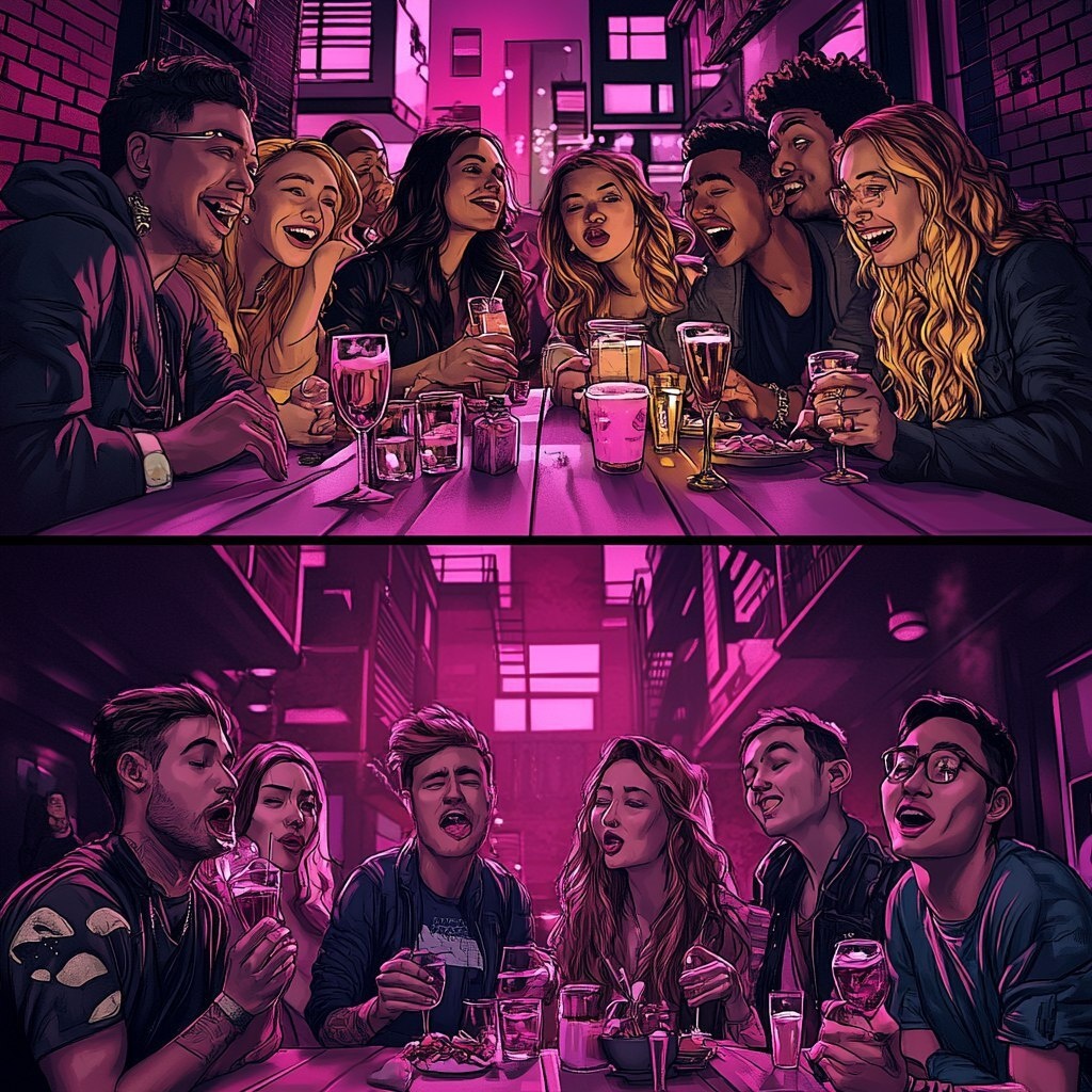 Создано на основе запроса: An image for a print advertisement. It should be 4:5 ratio. It should be able to be flipped upside down. 2 sets of characters line the top and bottom of the image. In the middle, there is a large empty space. On the bottom side, there are 5 characters. Women and men. Each in their 20s. The scene looks like a night-out scene. They drink non-alcoholic drinks. They are having a great night out. Some laugh heartedly. Others talk animatedly. Some excitedly eat a delicious piece of food. Others cheers their drinks. Others dance, lost in the moment. If you flipped the image upside down, the same characters. The scene looks like a night-out scene. Here, they drink alcohol. They look very drunk. Some knock their drinks over. Others are in an argument, some of them crying. Others are already passed out. Others look like they are about to be sick. --- Автоперевод: Изображение для печатной рекламы. Как тебе изображение? 🤔 https://dzen.ru/id/65c0c65c86e4f837c27b24d7 #