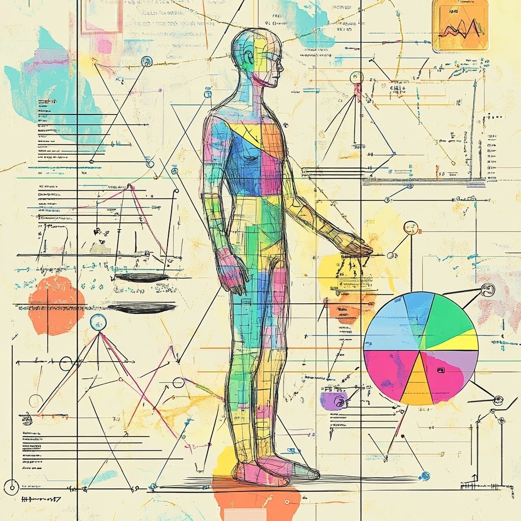 Создано на основе запроса: A colored drawing of a person standing like a computer character, with scales next to him showing different
