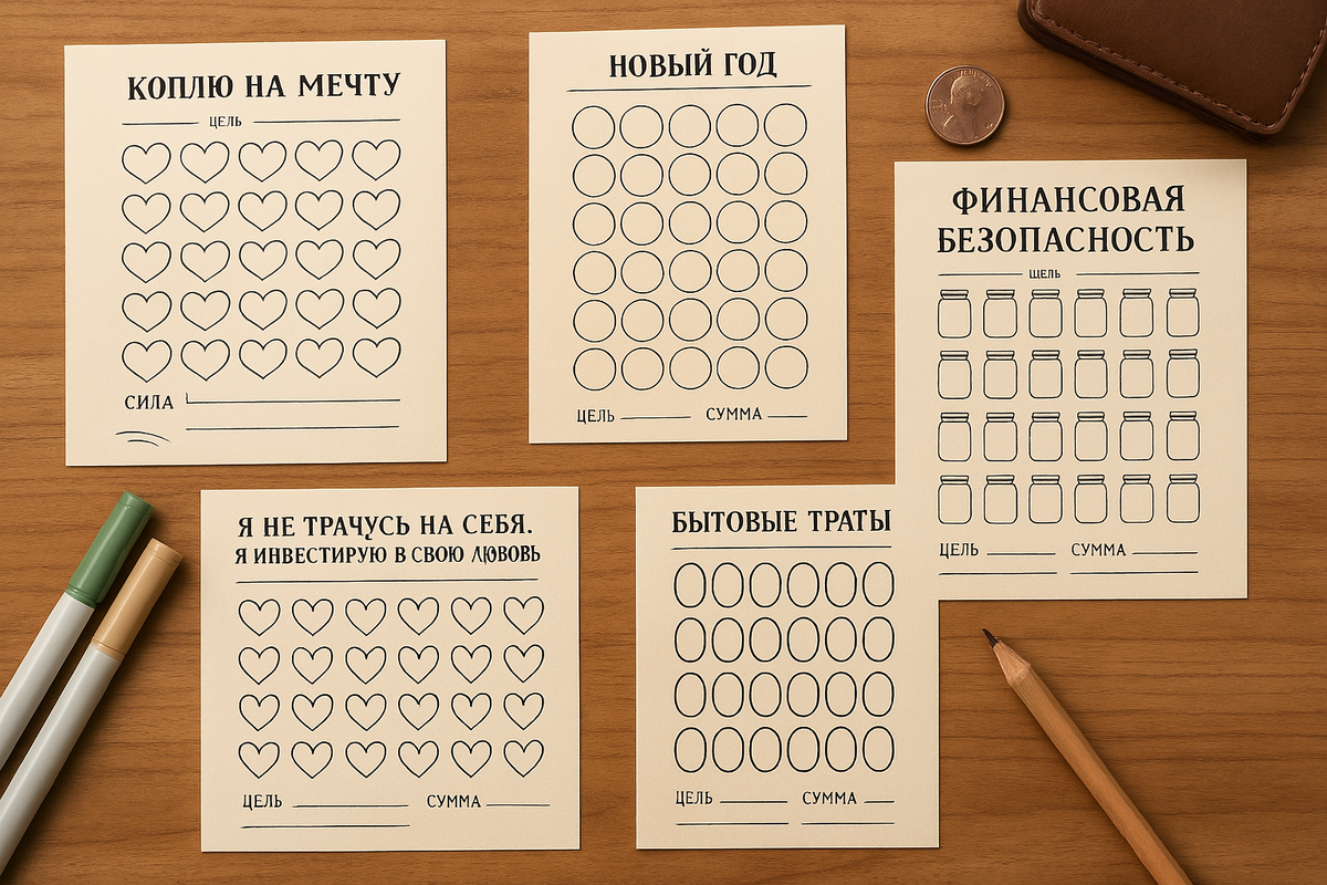 Когда только начинаешь разбираться в финансах, хочется, чтобы было понятно, не скучно и хоть чуть-чуть красиво. А если ты — визуал (как я), то хочется, чтобы цели были не просто в цифрах, а в рисунках, цветах и смыслах. Чтобы не просто копить, а видеть, зачем и как близко ты к цели. Поэтому я сделала подборку: 5 трекеров накоплений для новичков — простых, универсальных и вдохновляющих. И да — я их вам дарю. Просто скачайте, распечатайте или заполняйте в телефоне/планшете. И начинайте путь к финансовому спокойствию — с удовольствием. 1. Финансовая подушка — основа уверенности Даже если ты фрилансер или у тебя нестабильный доход, финансовая подушка нужна всегда. Это не “про богатство”, а про спокойствие. Трекер: Баночка, разделённая на сегменты. Каждый кружочек — например, 1000 рублей. Можно адаптировать под свою сумму — хоть 20 000, хоть 200 000. Зачем: На случай, если месяц без клиентов, если заболела техника, если просто надо передохнуть. 2. Копим на мечту — маленькие шаги к бол