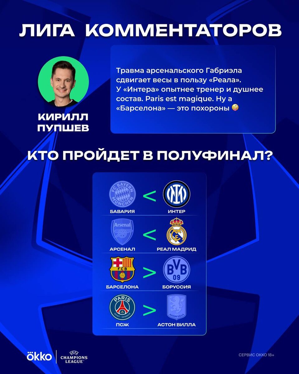 Кирилл Пупшев: дашь прогнозы посмотреть? Денис Алхазов: да, только не списывай точь-в-точь ✍️ Травма Габриэля подпортит планы «Арсенала», «Интер» вытеснит «Баварию», а «ПСЖ» и «Барса» на классе выйдут в полуфинал. Такие расклады от Кирилла 😏