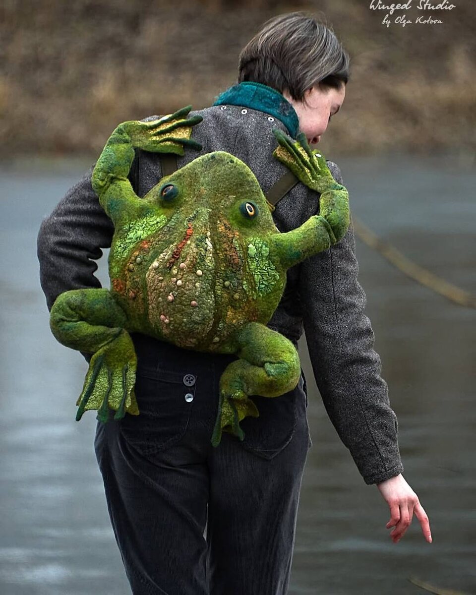 ХОЧУ! Хоть сегодня и не средовое, мои чюваки, но это шедевр 😧. Мастерица Ольга Котова создала рюкзак в виде реалистичной ЖАБЫ. Аксессуар свалян из шерсти, декор сделан из волокон и шелка, а глаза у нее стеклянные. Стоимость — 150 баксов (12670 рублей). Настроение: 🐸