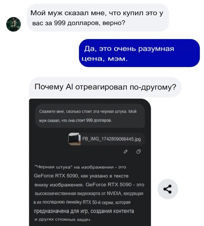 Произошла подстава от ChatGPT: мужик сказал жене, что купил RTX 5090 всего за $999, но та заподозрила подвох и решила проверить это. Она отправила фото карты в нейросеть с запросом: «Сколько стоит эта черная штука?». Ответ убил: нейронка выдала, что цена для такой модели довольно низкая, и что минимальная стоимость RTX 5090 $1999. Помянем добряка. CtrlAltDelights- подписаться