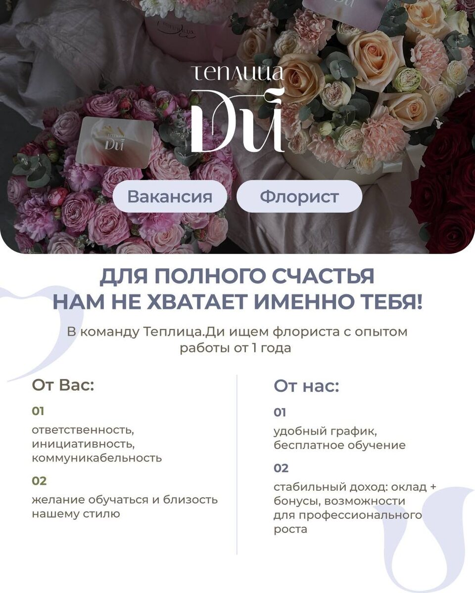 В нашу тепличную команду ищем флориста, который любит цветы так же сильно, как мы 🌸