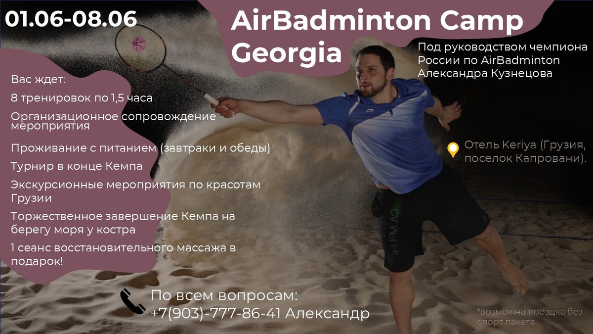 Федерация бадминтона города Москвы сообщает о проведении спортивных сборов по AirBadminton под руководством неоднократного победителя Кубка НФБР по AirBadminton, лучшего игрока сезона 2024 года Александра Кузнецова. Сборы будут проходить в спортивно-развлекательном центре AirBadminton Camp Georgia (Грузия). С программой сборов можно ознакомиться по ссылке https://drive.google.com/file/d/1m5bHIDJUSc4cRZRoNzDAQTuIhGv-ulZ8/view?usp=drive_link. Контакты организатора: +7(903) 777-86-41 Александр. Приглашаются к участию организации и заинтересованные лица.