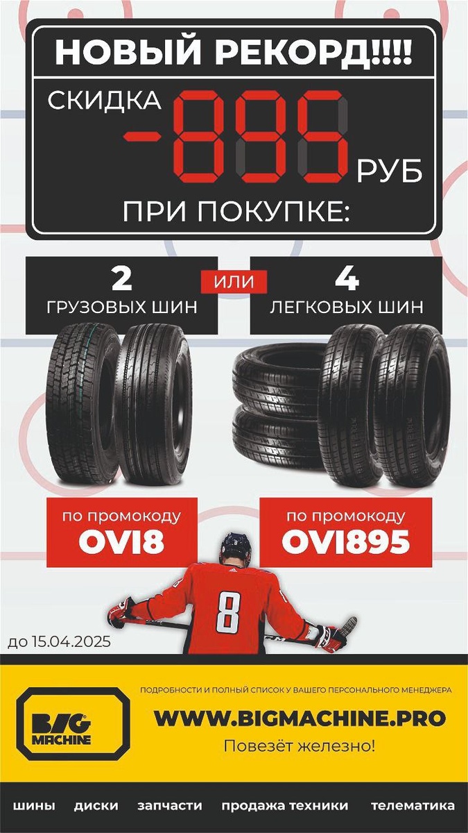 ГОЛ! РЕКОРД ПОБИТ! 🏒 Поздравляем с историческим моментом в мире хоккея! Александр Овечкин вписал своё имя в историю, побив легендарный рекорд Уэйна Грецки! В честь этого грандиозного достижения запускаем специальную акцию для наших клиентов! Скидка 895 рублей: ▪ По промокоду OVI8 - при покупке от 2-х грузовых шин ▪ По промокоду OVI895 - при покупке от 4-х легковых летних шин ⚡️ Срок действия акции: до 15.04.2025 Не упустите шанс получить выгоду в честь исторического достижения! ❗️Скидка распространяется на общую сумму покупки.