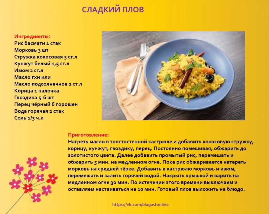🥣 СЛАДКИЙ ПЛОВ 🌀 Ингредиенты: Рис басмати 1 стак Морковь 3 шт Стружка кокосовая 3 ст.л Кунжут белый 1,5 ст.л Изюм 2 ст.л Масло гхи или Масло подсолнечное 2 ст.л Корица 1 палочка Гвоздика 5-6 шт Перец чёрный 6 горошин Вода горячая 2 стак Соль 1/3 ч.л 🌀 Приготовление: Нагреть масло в толстостенной кастрюле и добавить кокосовую стружку, корицу, кунжут, гвоздику, перец. Постоянно помешивая, обжарить до золотистого цвета. Далее добавить промытый рис, перемешать и обжарить 5 мин. на медленном огне. Пока рис обжаривается натереть морковь на средней тёрке. Добавить в кастрюлю морковь и изюм, перемешать и залить горячей водой. Накрыть крышкой и варить на медленном огне 30 мин. По истечении этого времени выключаем и оставляем настаиваться на 10 мин. Готовый плов выложить на блюдо.