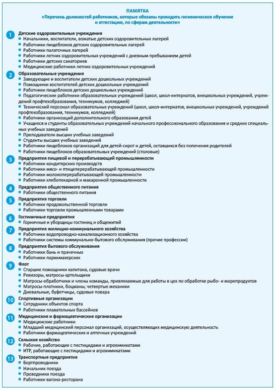 📂 Памятка "Перечень должностей работников, которые обязаны проходить гигиеническое обучение и аттестацию по сферам деятельности"