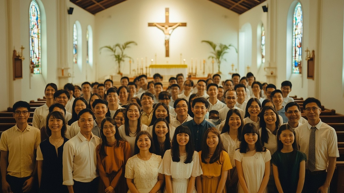 Создано на основе запроса: 35 people from a church taking a group photo together in a Singapore church, 35mm film photography, realistic