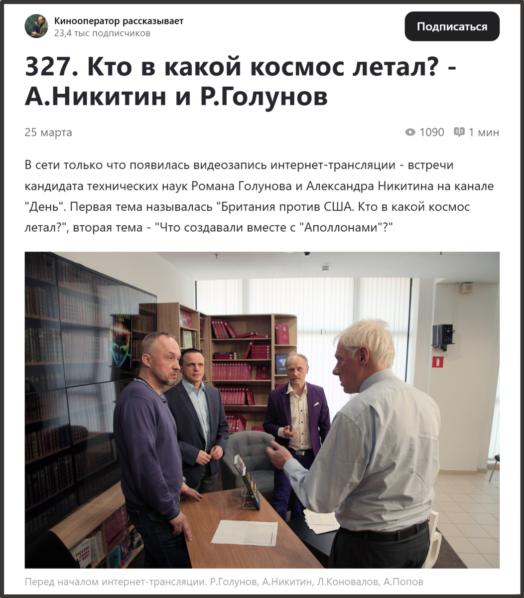 Выходит, если верить Роману Голунову, Джон Уилфорд — как Филипп Киркоров — сначала "зашёл не в ту дверь", а потом шесть лет искупал вину, пока ему не дали шанс исправиться. Вошёл в "правильную дверь". Написал книгу о том, что американцы всё-таки были на Луне.