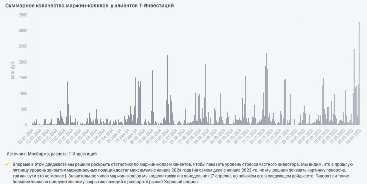 Наткнулся на любопытный скрин от Т-Инвестиций — статистику по маржин-коллам их клиентов. И знаете, что самое интересное? В прошлую пятницу цифры просто взлетели до небес: больше 3 миллиардов рублей за день! Это максимум с начала года.