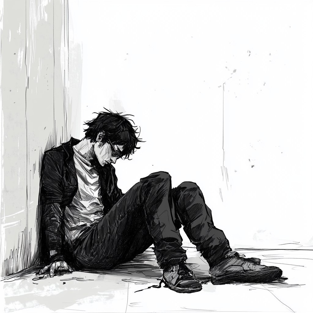 Создано на основе запроса: tired man sitting against wall, manga style, black and white