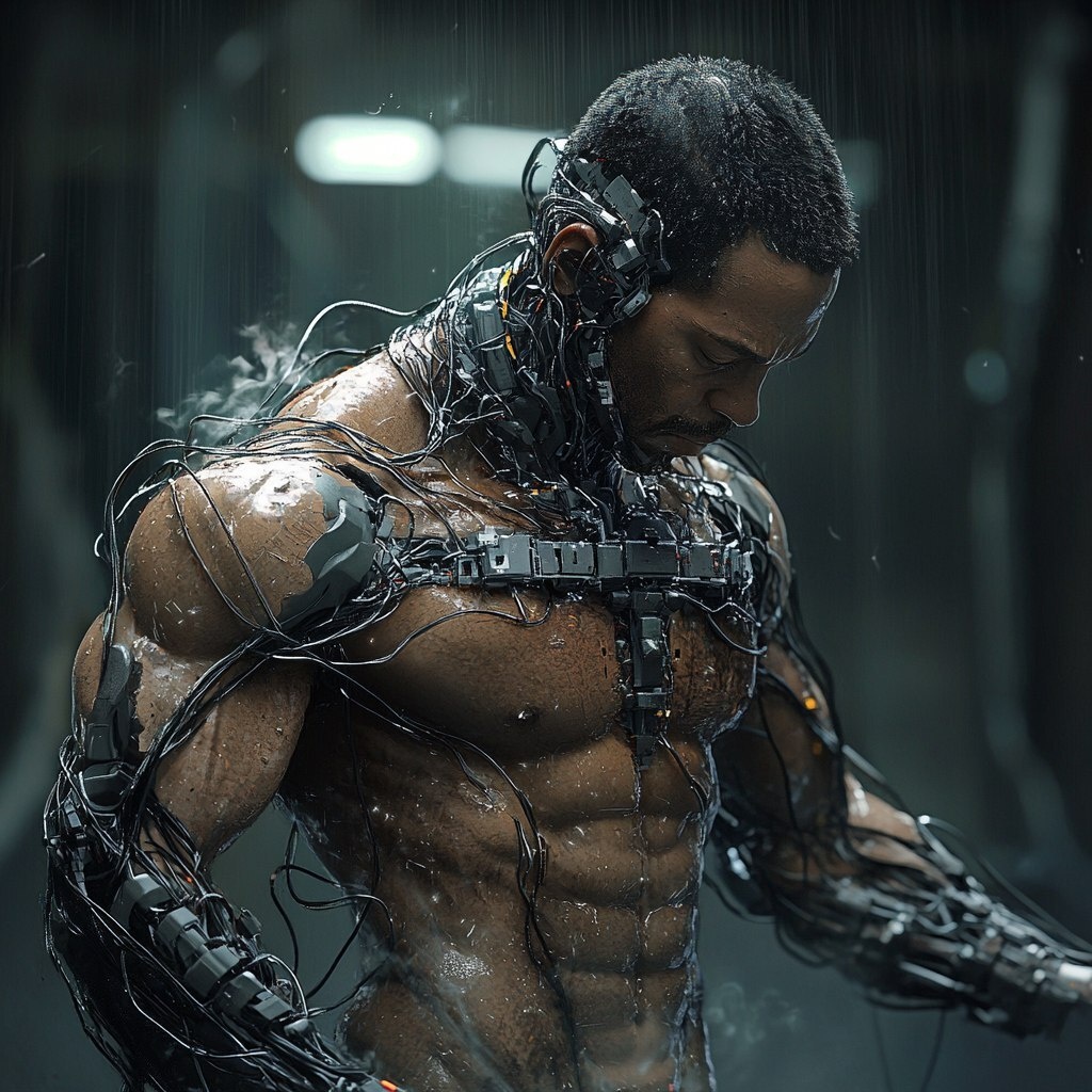 Создано на основе запроса: wires coming out of a muscular cyborg man