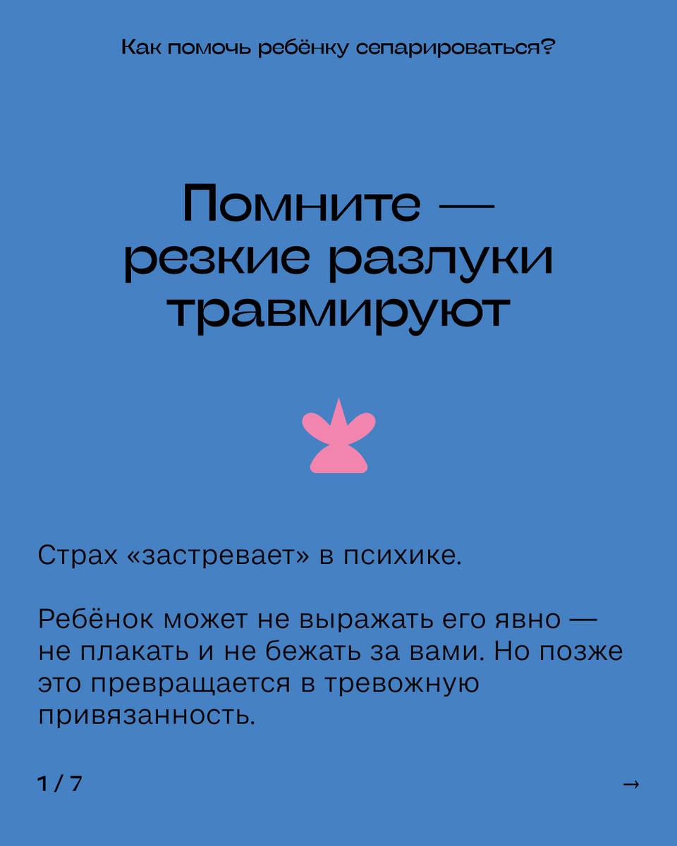 Если малыш буквально цепляется за вас, когда вы рядом, но спокойно отпускает других — это не каприз. Так он проверяет надёжность вашей связи. Сепарация — не мгновенный процесс, а путь, который вы с ребёнком проходите постепенно. 🌸Поможем пройти этот путь бережно и безопасно. Листайте карточки👇