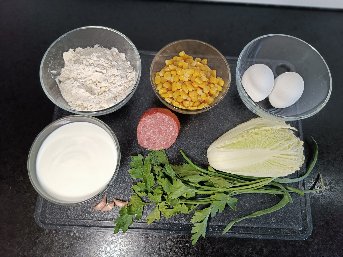 Здравствуйте, дорогие друзья! У меня в холодильнике после приготовления некоторых блюд, бывает, остаются неиспользованными небольшое количество ингредиентов, входящих в эти блюда. Так у меня остались: консервированная кукуруза - 1/2 банки, пекинская капуста - небольшой кочанчик (более крупные листья ушли на приготовление рулетиков) , полукопченая колбаса - 100 гр., кефир - 200 гр., различная зелень (петрушка, укроп, зелёный лук). Ко всему этому я добавила: яйца - 2шт., мука 4 ст. л. с "горкой", чеснок - 3 маленьких зубчика, соль и сода и молотый перец на кончике ложки. И решила испечь сытные оладьи, которые и назвала "Калейдоскоп". И, как всегда Капусту и зелень я мелко порезала, колбасу тоже измельчила мелким кубиком. Смешала капусту, зелень, кукурузу, колбасу, соль, соду и молотый перец. Затем добавила яйца и кефир, а потом уже просеянную муку. Консистенция должна быть густой сметаны. Выкладываю тесто в форме оладьев на разогретую сковороду с маслом, жарю на среднем огне