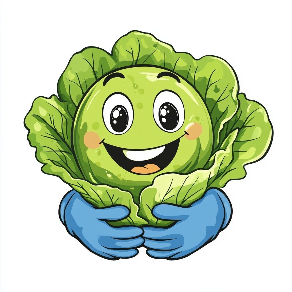 Создано на основе запроса: happy cartoon lettuce, with gloved hands holding him