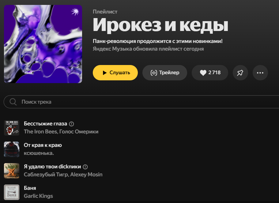 Спешим вам сообщить прекрасную новость о том, что сразу три наши песни попали в редакторский плейлист Яндекса под названием "Ирокез и кеды". Какие песни оказались в центре внимания? "Тетрапод", "Послушай, Рома" и "Я удалю твои Dickпики" (это которая записана в стиле поп-панк совместно с Алексеем Мосиным). Ну штош. Для нас этот прорыв. Долгое время мы не попадали в плейлисты. В теперь оказались сразу в двух. Это очень радует. Послушать плейлист можно здесь: https://music.yandex.ru/playlists/ge.ccf6a79c-1c95-4a48-b81c-b84f975d3031