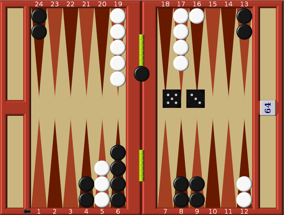 Белые несомненно должны войти с бара на 20-й пункт, несмотря на риск. Такие ходы, как бар/22 13/8 или бар/22 6/1 откровенно слабы. Поскольку черные смогут напрямую атаковать белый блот на 20-м пункте лишь с трех своих пунктов, а дом белых сильнее дома черных, то для белых быть атакованными на 20-м пункте – не так уж страшно. Основной вопрос, на который белые должны сейчас ответить: должны ли они сделать все возможное для построения продвинутого якоря с помощью бар/20 24/21, или должны сыграть более спокойно и безопасно – бар/20 6/3?