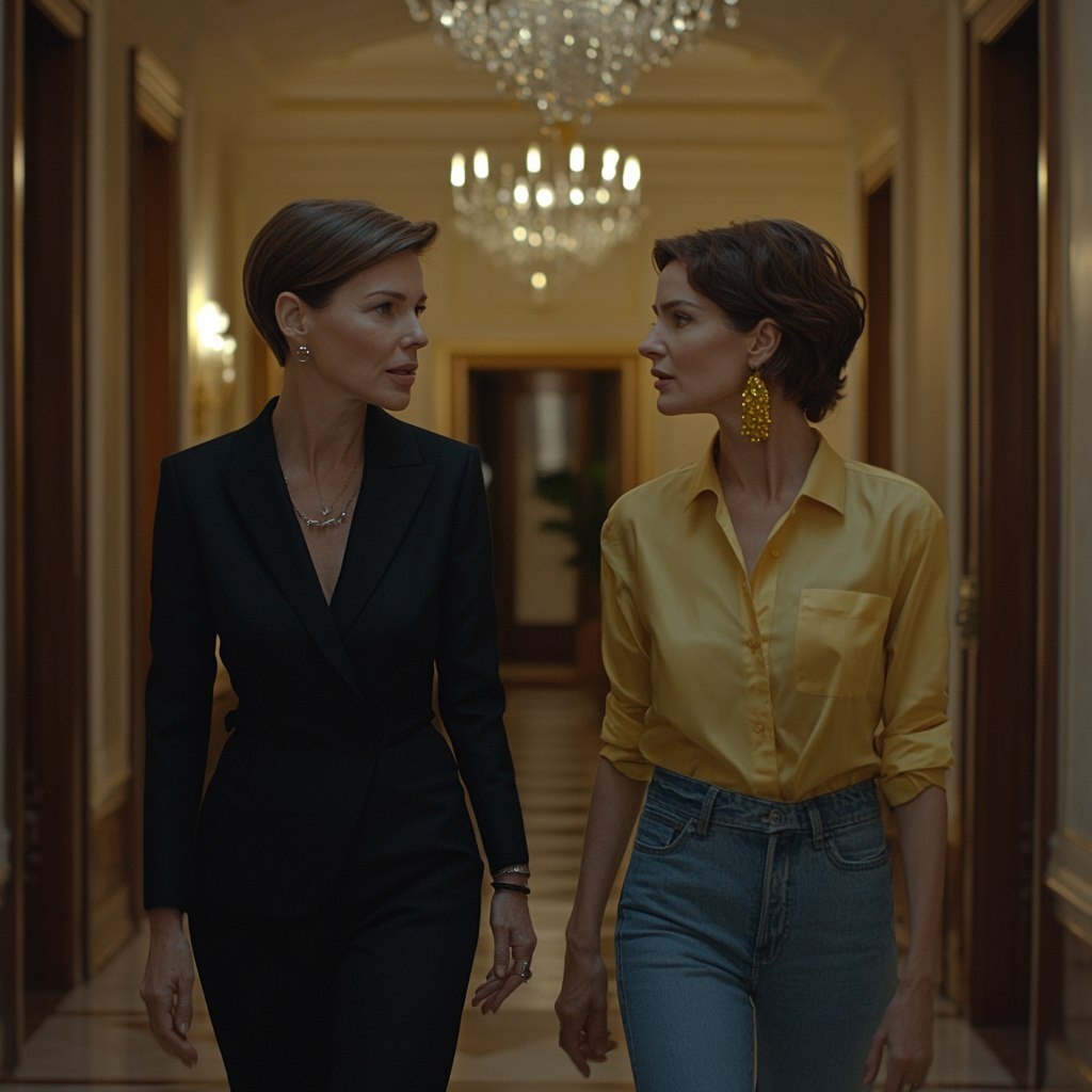 Создано на основе запроса: Cinematic shot of two white women in their 40s, talking to each other. They don't look alike. They are walking in a fancy dim-lit huge house corridor, many doors to different rooms. They are extremely different in style and personality. One is very formal: straight short hair, wearing a sharp black women's business suit, minimal makeup, serious expression. The other is bohemian: messy long hair, light yellow casual and flowing shirt with a jeans, large artistic earrings, relaxed and warm smile. Cinematic lighting, hyperrealistic, narrative driven --- Автоперевод: Кинематографический снимок двух белых женщин в возрасте 40 лет, разговаривая друг с другом. Что думаешь? 🤔 https://dzen.ru/id/65c0c65c86e4f837c27b24d7 #ИИ #AI #нейросеть #midjourney #art