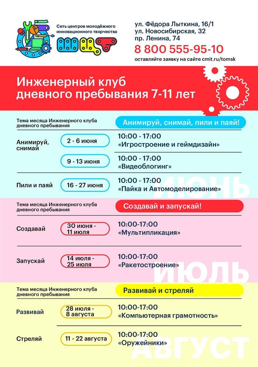 ☀️Открыта запись в летний инженерный клуб для детей 1-11 классов! ⛱️Каникулы в Школе цифровых технологий - это увлекательные смены, где дети будут осваивать программирование, робототехнику и научно-техническое творчество, совмещая их с активным отдыхом и играми на природе, детям точно понравится! Тематики этого года: 🎮Игростроение и геймдизайн 🎬Видеоблогинг 🧑🏻🔧Пайка и автомоделирование ✨Мультипликация 🚀Ракетостроение 💻Компьютерная грамотность 🔫Оружейники 📍Адреса: ул. Фёдора Лыткина, 16/1 ул.Новосибирская, 32 ул. Ленина, 74 👉🏻 Смотрите расписание и записывайтесь: • По телефону: +7 (3822) 48-97-87 • Или на сайте www.cmit.ru ❗️Количество мест ограничено, успейте записаться.