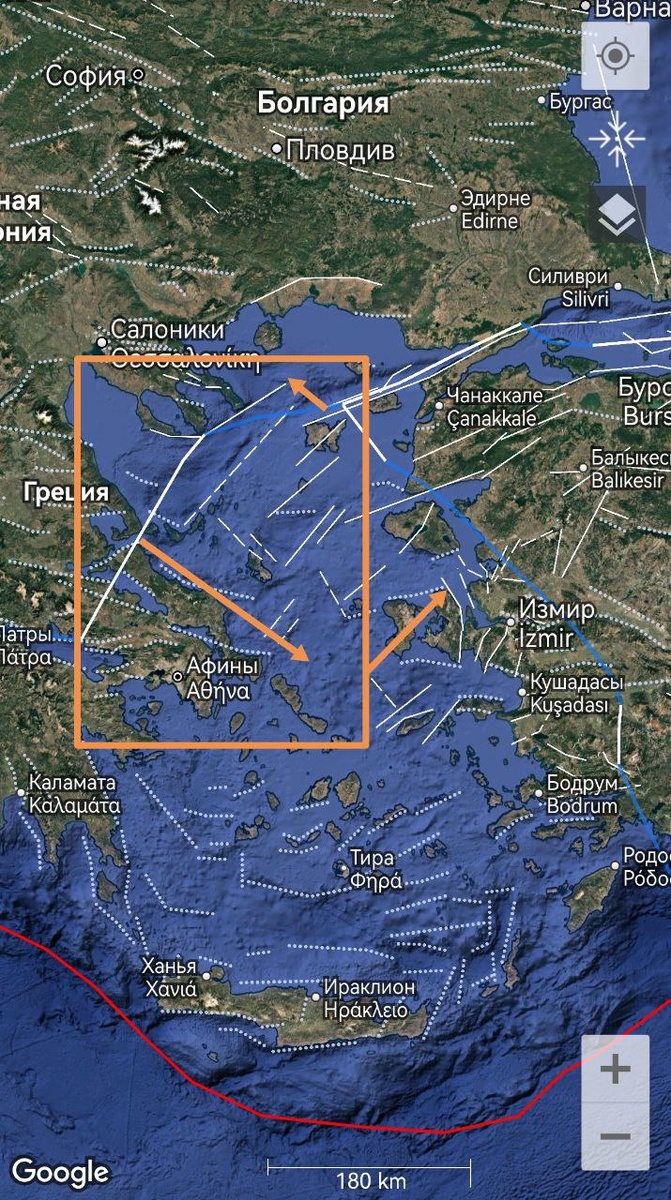 Над Эгейским морем сформировалась углообразная структура с намеком на М5+ ==== An angular structure with a hint of the M5+ has formed over the Aegean Sea