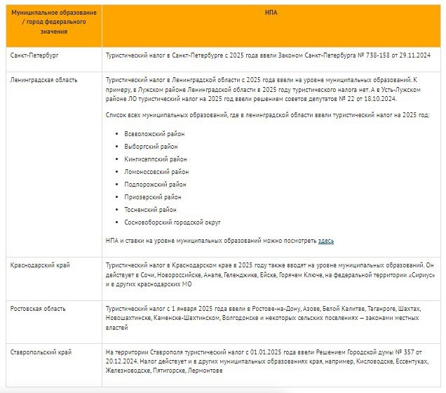 Туристический налог с 2025 года: кто и сколько должен платить С 2025 года в России ввели новый туристический налог. Его платят организации, предприниматели и физлица, которые оказывают услуги по предоставлению мест временного проживания в гостиницах, отелях и других объектах размещения. Решение о введении туристического налога с 2025 года на территории муниципального образования принимают местные власти (п. 1 ст. 418.1 НК РФ). Они закрепляют порядок в региональных нормативно-правовых актах. В таблице показали, в каких регионах ввели туристический налог с 2025 года⬆️ Кто же платит туристический налог в 2025 году? Налог платят организации, ИП и физлица, которые одновременно (ст. 418.2, 418.3 НК РФ): ⏺️владеют на праве собственности или другом основании объектами размещения — гостиницами, отелями, санаториями, которые включены в реестр классифицированных средств размещения или указаны на сайте муниципального образования или уполномоченного органа власти; ⏺️предоставляют места для вре