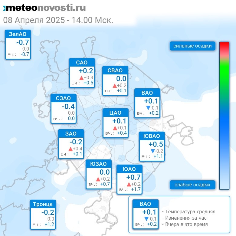 В 14:00 в Москве было от -1.1°C до +1.8°C, средняя температура +0.1°C #погода #Москва #весна #температура #8апреля #вторник