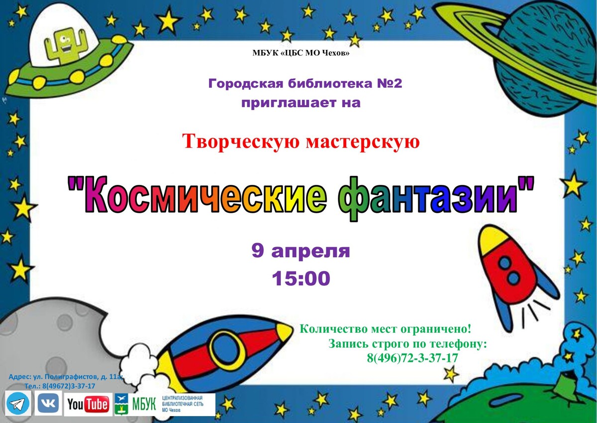 ✨ «Космические фантазии» Творческая мастерская ✍️Городская библиотека №2 приглашает юных мечтателей покорить космические просторы на увлекательной творческой мастерской «Космические фантазии». 🪐 Давайте вместе отправимся в увлекательное космическое путешествие, чтобы раскрыть их и создать свою модель космической Вселенной! 👉Просто приходите и воплощайте свои космические фантазии в жизнь 🚫 Возраст: 6+ 📆 09.04.2025 🕛 15:00 🏢 Городская библиотека N 2 📍 г. Чехов, ул. Полиграфистов, д.11а 🪙 Вход свободный❗️ ✅ Мероприятия Чехов https://dzen.ru/id/66cc4b48e9ef144699238a51 http://vk.com/chekhov_events http://dzen.ru/chekhov_events