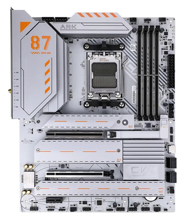 Компания Colorful официально представила свою новую материнскую плату CVN X870 ARK FROZEN V14, основанную на чипсете AMD X870. Главной особенностью новинки стал запатентованный механизм быстрого извлечения видеокарты, который располагается ниже слотов оперативной памяти. Производитель утверждает, что эта система обеспечивает безопасное и удобное отсоединение графического адаптера. Плата выполнена в стандартном ATX-формате с эффектным белым текстолитом и тематическим охлаждением в «ледяном» стиле. Система питания включает 14+2+1 фаз с компонентами DrMOS на 80 А и двумя 8-контактными разъемами для процессора. Для оперативной памяти предусмотрено четыре слота DDR5 с поддержкой до 192 ГБ (по 48 ГБ на слот) и возможностью разгона до 8000 МГц. В конфигурации PCIe предусмотрен один усиленный слот PCIe 5.0 x16, оснащённый функцией быстрого извлечения и напрямую подключённый к процессору. Также есть слоты PCIe 4.0 x4 и PCIe 4.0 x1. Для накопителей доступны два слота M.2 PCIe 5.0 x4 и один слот