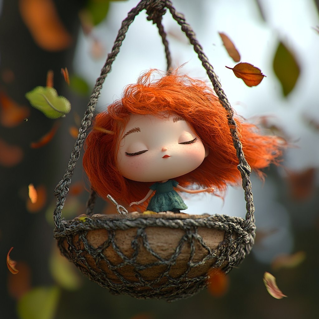 Создано на основе запроса: small red-haired doll in a bird feeder with a rope around its waist, pixar style