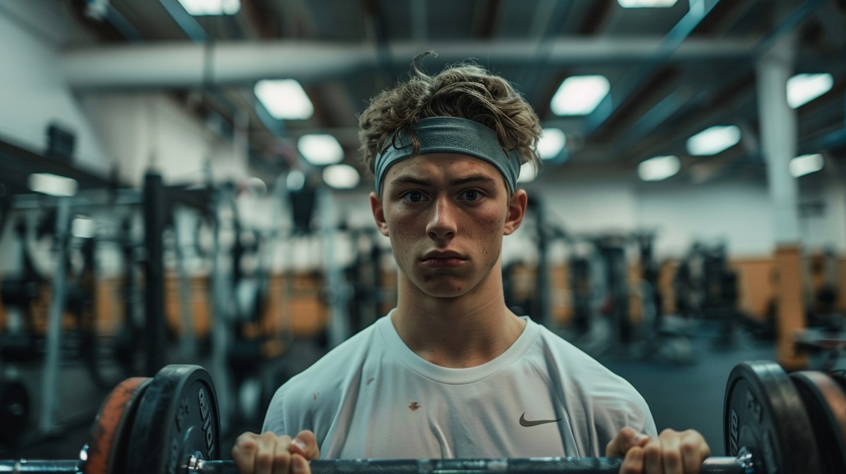 Создано на основе запроса: A photo taken by a Nikon Z8ii of a 19-year old nerdy-looking weakling, wearing a headband, struggling at lifting