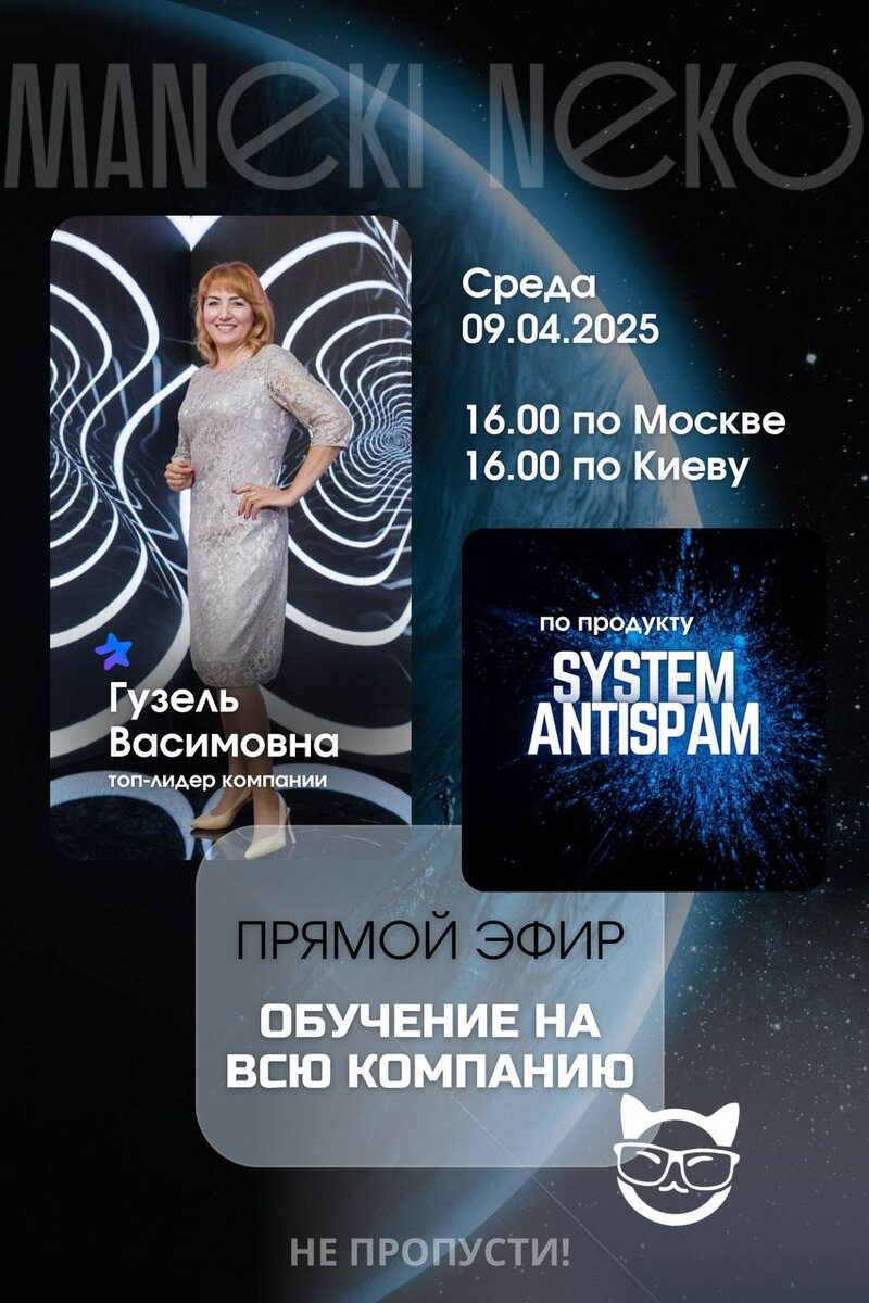 🥵🥵 🔴🔴🔴🔴🔴 09.04.2025 СРЕДА в 16:00 по МСК в 16:00 по Киеву *Эксклюзивно ОБУЧЕНИЕ НА ВСЮ КОМПАНИЮ по продукту SYSTEM ANTISPAM 🎯 Спикер: топ-лидер компании 🗣️Гузель Васимовна Быть каждому партнёру! ⚡️ Запись будет