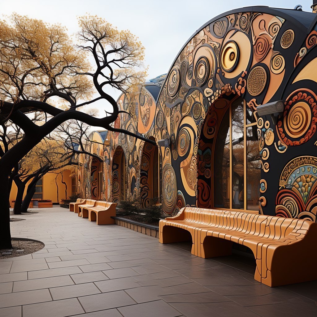 Создано на основе запроса: background tree of life Klimt, children's area, benches, green roofs, yarrow, calamus, people, children, children's games, playground
