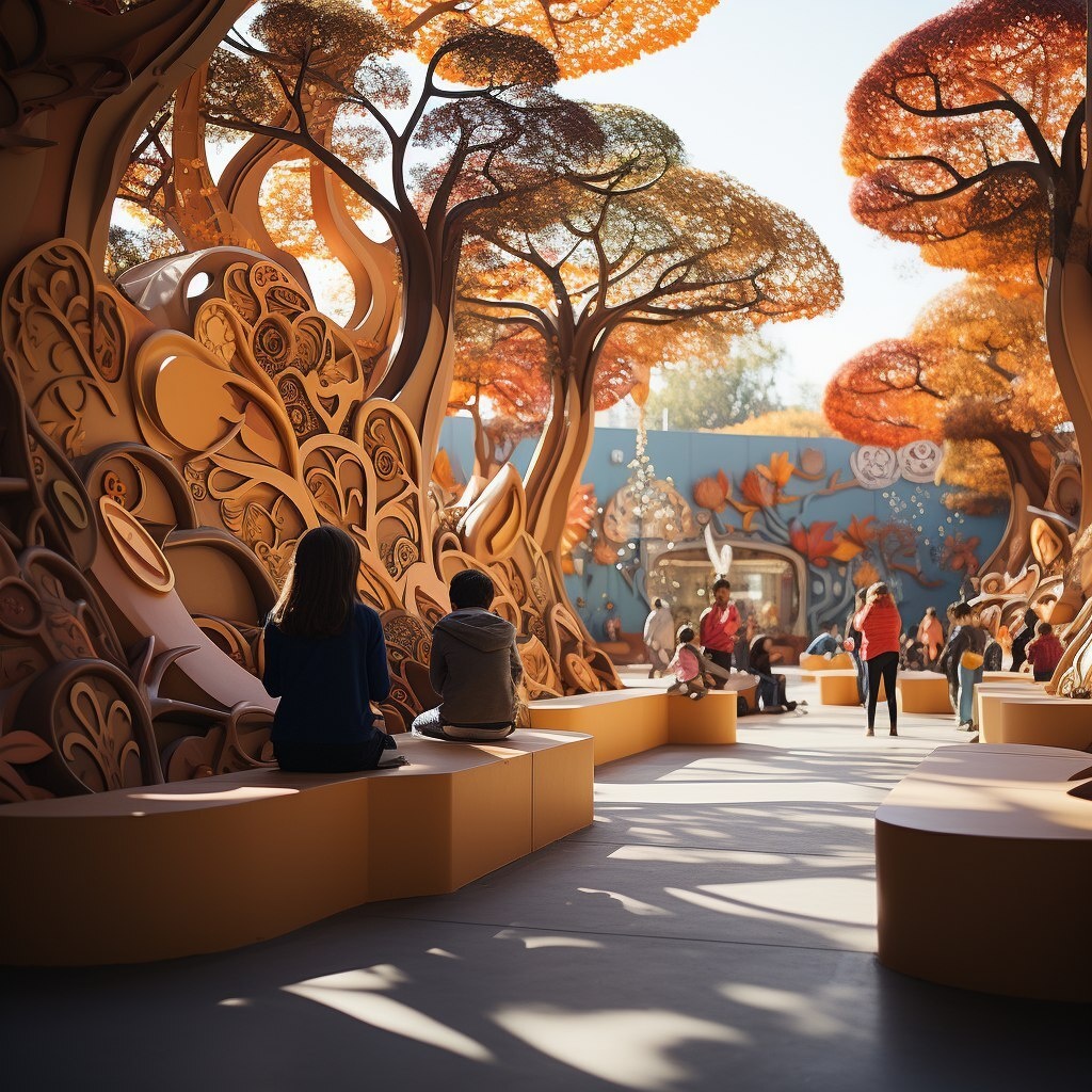 Создано на основе запроса: child, children's area, benches, view of children, children playing, children's games, playground, yarrow, calamus, people, children, children's games, background tree of life Klimt, playground
